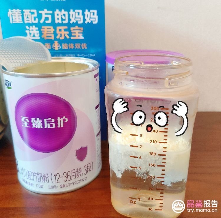 宝宝口粮的选择,作为妈妈的我会更加在意奶粉的安全,安全的奶粉能够保证宝宝的健康成长,成分安全,品质优良能够大大提升信赖值!宝宝的奶粉除了基础的配方成分,还会观看选择添加的配方成分,每款奶粉都有比较突出的表现,我就我家宝宝从小肠胃就比较敏感,抵抗力比较弱,所以我选择婴幼儿配方奶粉就会优先考虑,容易吸收消化,可以帮助宝宝提升抵抗力的!经过对君乐宝至臻启护婴幼儿配方奶粉试用和了解,对这款奶粉新的认识。君乐宝至臻启护奶粉的配方设计理念核心是“亲和人体、易消化吸收”,特别适合肠胃功能尚未发育完善、需要精心呵护的宝宝。全链益生元组合(GOS+PDX)肠道健康的“守护卫士”它采用了低聚半乳糖(GOS)和聚葡萄糖(PDX)的科学组合,大大减少宝宝出现肠道问题,帮助宝宝嗯嗯畅通无阻!而且奶粉采用了适度水解工艺,将大分子的牛奶蛋白提前分解成更小的肽段和氨基酸,大大降低了蛋白质的致敏性,使得奶粉更容易被宝宝娇嫩的肠胃消化和吸收,能有效减少由蛋白质引起的胀气、烦躁等不适反应。君乐宝至臻启护奶粉里还添加了可以帮宝宝宝提升自护力的配方。核苷酸:增强宝宝自身抵抗力。五种核苷酸:帮助支持婴幼儿免疫系统发育。充足的铁、钙、维生素D:满足宝宝骨骼和身体全面发育的需求。让宝宝有个好体质,少生病!口感也是决定宝宝能否顺利接受新奶粉的关键,这也是我非常关心的一点。君乐宝至臻启护婴幼儿配方奶粉的粉体呈天然的乳黄色,粉质非常干燥、细腻。按照包装说明,用40-50°C的温水进行冲调。奶粉的溶解速度很快,轻轻摇晃奶瓶后,杯壁没有出现明显的结块或挂壁现象,溶液均匀,底部仅有极少量未溶解的颗粒(属于正常现象)。整体冲调体验良好。闻起来清淡自然,没有浓烈甜腻的香精味,而是一种天然的、淡淡的奶香。口感入口细腻顺滑,没有涩感或粉感,甜度较低,更接近母乳的清淡口感。宝宝初次尝试时,接受度通常会比较高。我家小小宝夏天的时候都不爱喝奶,也是也尝试了不少其他嗯奶粉,都没有选择到合适的,但尝试了君乐宝至臻启护婴幼儿配方奶粉,一口气就喝完了180ml的奶液,还乐呵呵的,看到这样的表现,老母亲真的很欣慰。找到他爱喝而且品质出众的奶粉确实是件不容易的事,还好遇到了君乐宝至臻启护婴幼儿配方奶粉,价格也适合
