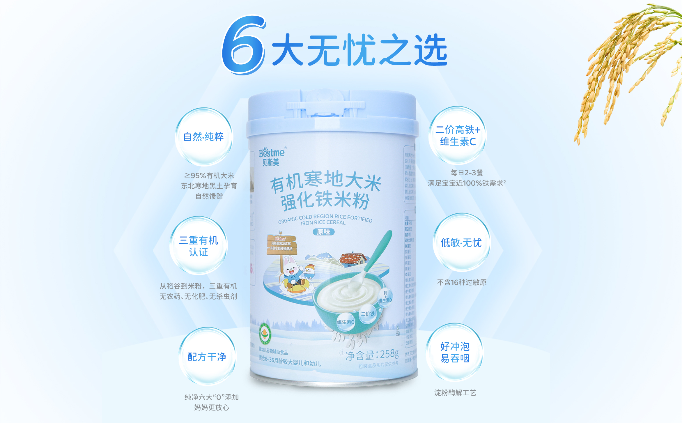 从自有有机水稻种植基地的源头管控,到高于国标的数百项检测,贝斯美只想把黑土地的天然、纯净与营养,安心送到宝宝口中!愿做妈妈们放心信赖的伙伴,一起陪伴宝宝健康快乐成长。