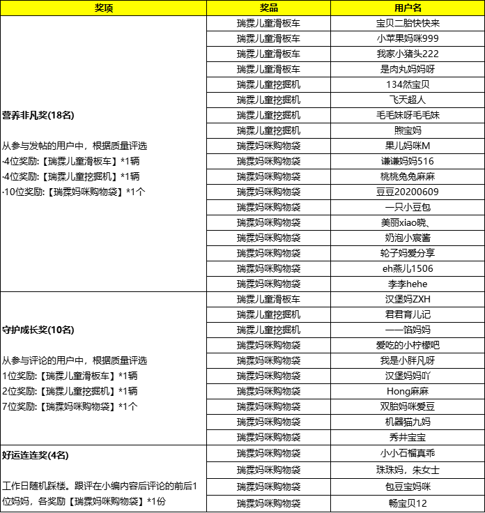 👏🏻恭喜以下获奖妈妈,没有获奖的亲亲也不要遗憾哦,积极发帖/回帖下次好运就砸中你啦~!