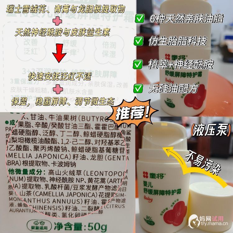 📌 总结:成分安心、效果能打,会一直回购!童将高倍特护霜真正做到了“有效护理”与“温和肤感”兼备~轻盈好吸收、快速褪红、强韧屏障,尤其推荐给敏感肌和秋冬容易干燥的宝宝!作为药学妈妈,我已经把它列入日常必备清单啦~如果你家宝贝也有泛红、干痒的困扰,不妨给童将一个机会,说不定会有惊喜哦!