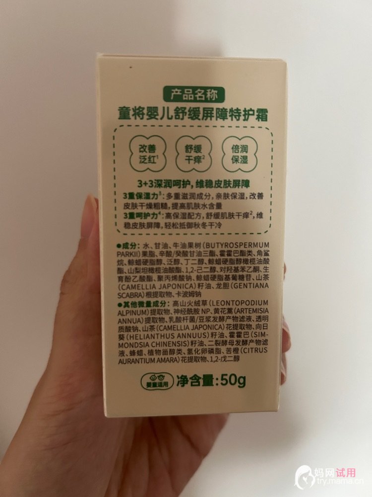 家里宝宝每到秋冬季节都会存在脸发皴甚至干燥脱皮的问题,试用过无数个婴儿面霜,贵的便宜的都试过,效果都不是太好。偶然看到童将高倍特护霜品鉴,就想试试,没想到就爱上了,真的是国货之光!这款是乳霜质地的,很好涂开。油脂含量高达20%,搭配专利仿生胎脂技术,提供高倍肌肤屏障和锁水保湿力。味道也淡淡的,宝宝很喜欢,抹的时候一点不抗拒,很享受的样子。抹过第二天,宝宝的脸还是很滋润,QQ弹弹的。而且前两天起的口水疹也消失了。它是药企研制,特意查了成分表,也很干净,没有不适合婴幼儿的成分,真心做到了良心国货,已经推荐给身边的宝妈了,很赞!