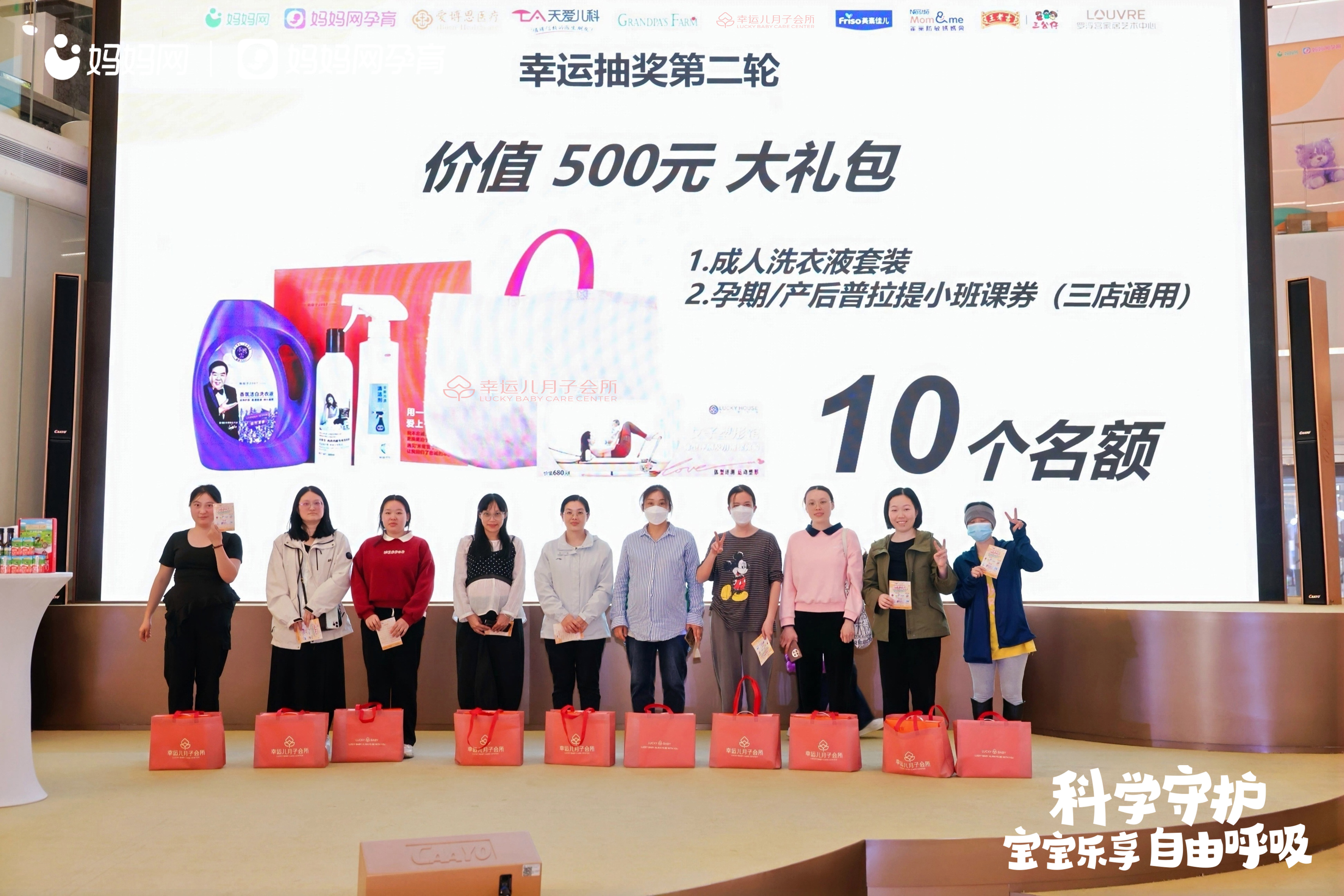 第一轮抽奖:巴布豆太空纸裤被20位准妈妈、宝妈抱走~第二轮由幸运儿月子会所提供的洗衣液套装、普拉提课券继续送送送!
