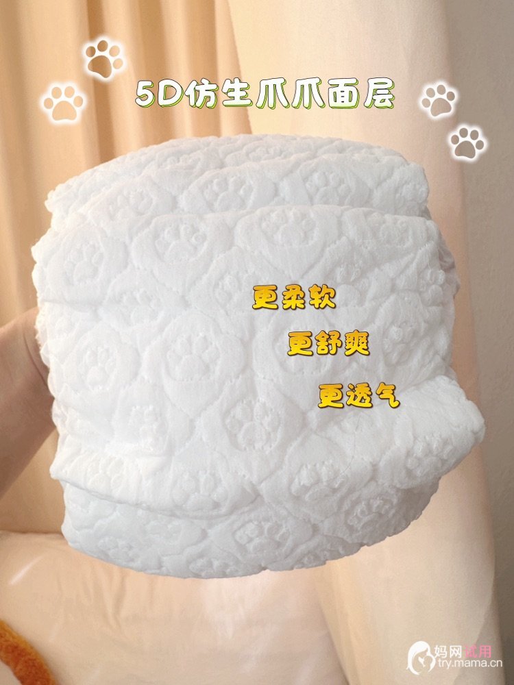 内置逆反渗黑科技,加速倒流扩散,减少尿液停留,像这款纸尿裤我家宝过夜毫无压力,第二天取下来满满一兜,但是宝宝屁股摸起来还是干干爽爽的,不闷宝宝屁屁,还有5D爪爪面层,让屁屁自由呼吸,就像给屁屁安了小空调,舒适自在。