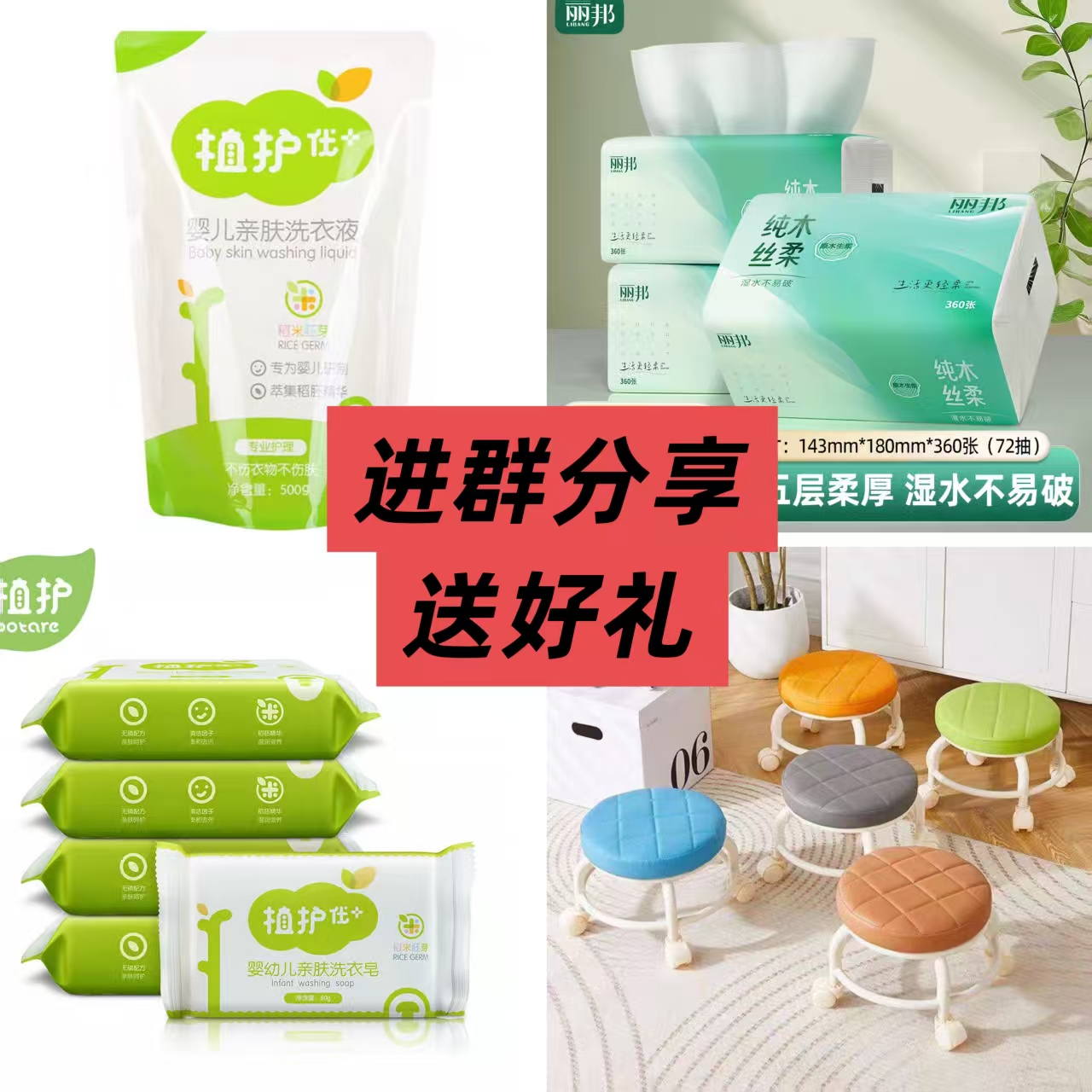 ➂进群邀请3个好友洗衣液袋装/洗衣皂3块/抽纸3包 ;邀请5个好友以上送换鞋凳/浴巾(非妈网小编好友)