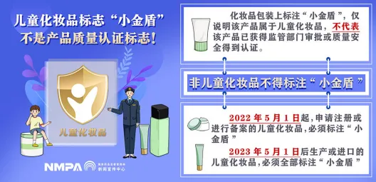 儿童化妆品应当在销售包装展示面标注国家药品监督管理局规定的儿童化妆品标志——“小金盾”。