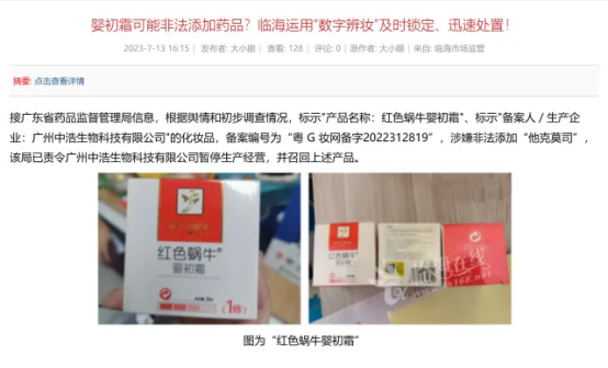 但在23年中发生的“网红婴儿霜检出抗生素”事件中,一款名为红色蜗牛婴初霜的产品被送检确认非法添加“他克莫司”。