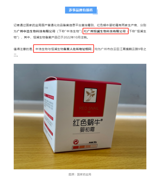 据南方日报报道,这款不及格面霜的生产商,其中一家便是广州恒澜生物科技有限公司,另一家生产商的备案人住所地址,则与它,相同。