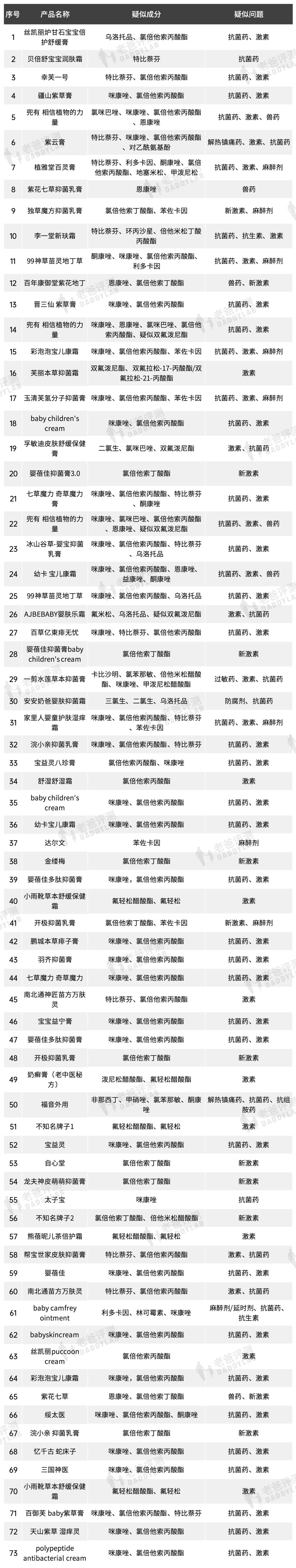 🔴本次曝光情况:105款消字号宝宝霜送检,73 款检出违禁成分