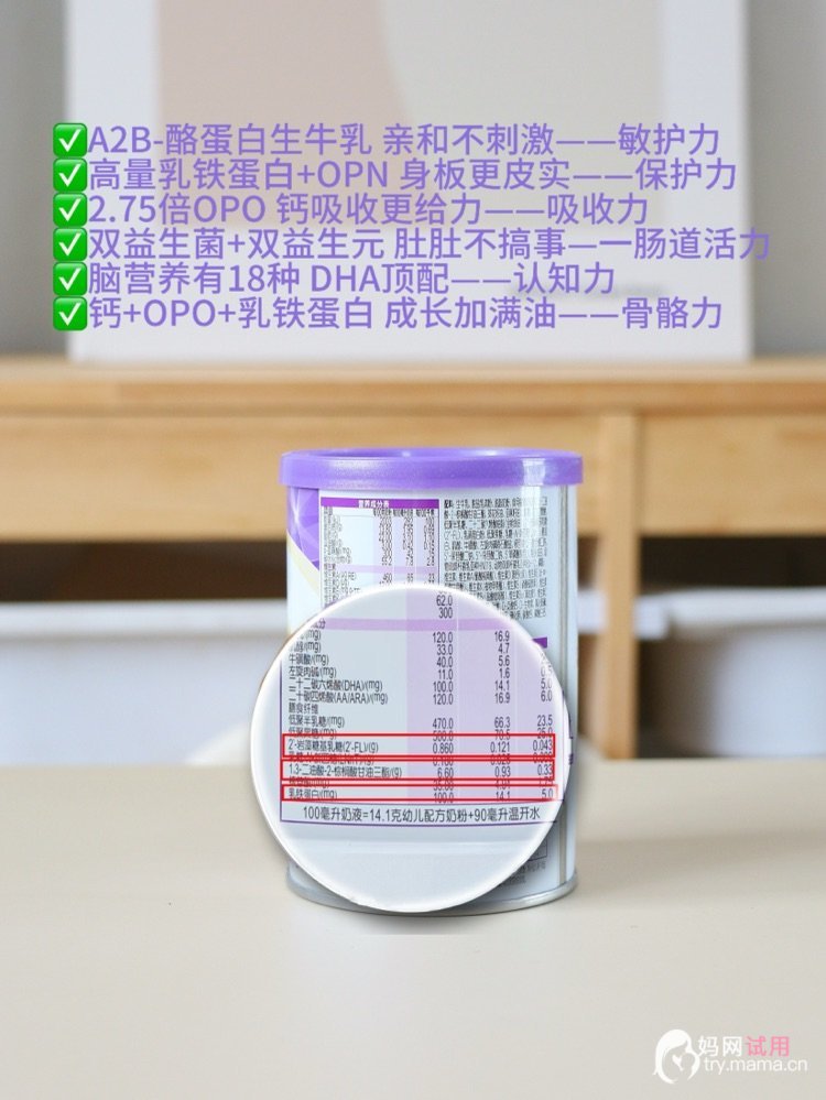 打开罐子,奶粉质地细腻,淡淡的奶黄色,闻起来是天然的奶香味,没有额外的香精感。配方也很戳我,不仅好吸收,还能帮宝宝守护肠道,