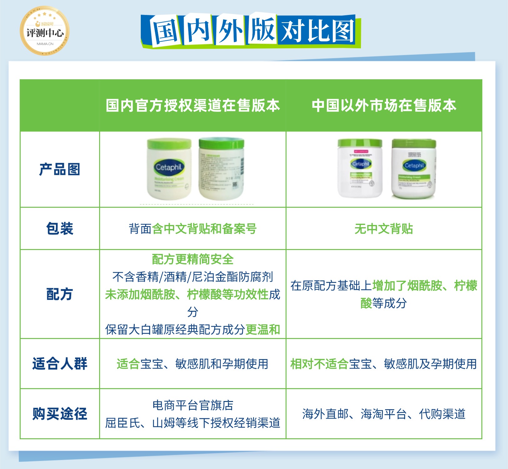 对了,大白罐有两种版本,海淘版(无中文背贴和备案号)在原配方基础上增加了烟酰胺、柠檬酸这些刺激成分,不太适合孕妇和宝宝及敏感肌;国内版则任然保留原经典温和的保湿成分体系,孕妈们购买大白罐,一定记得去国内官方渠道购买!